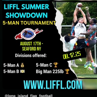 LIFFL “WINTER WARS II ” TOURNAMENT – DECEMBER 7th LIFFL “WINTER WARS II” 5-MAN TOURNAMENT Click Here to Fill out (or Print) a Registration form: https://liffl.com/registration/ DATE: DECEMBER 7th, 2025 LOCATION: BETHPAGE TURF FIELDS STYLE OF PLAY- 5-ON-5 NO-CONTACT 3 DIVISIONS/TEAM FEES: 5-Man “A” Division $375 ($1000 prize) (Full Rush, pop flags)5-Man “B” Division $300 ($600 prize) (2